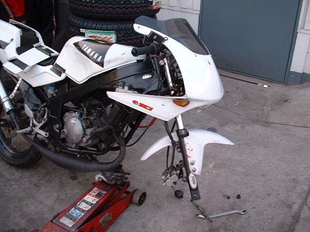 作業待ちのTZRは足がなくて心なしか寂しそうでした。