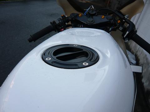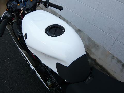 キャップからガソリンが漏れたかのように、白いタンクが一筋茶色く染まっている!!